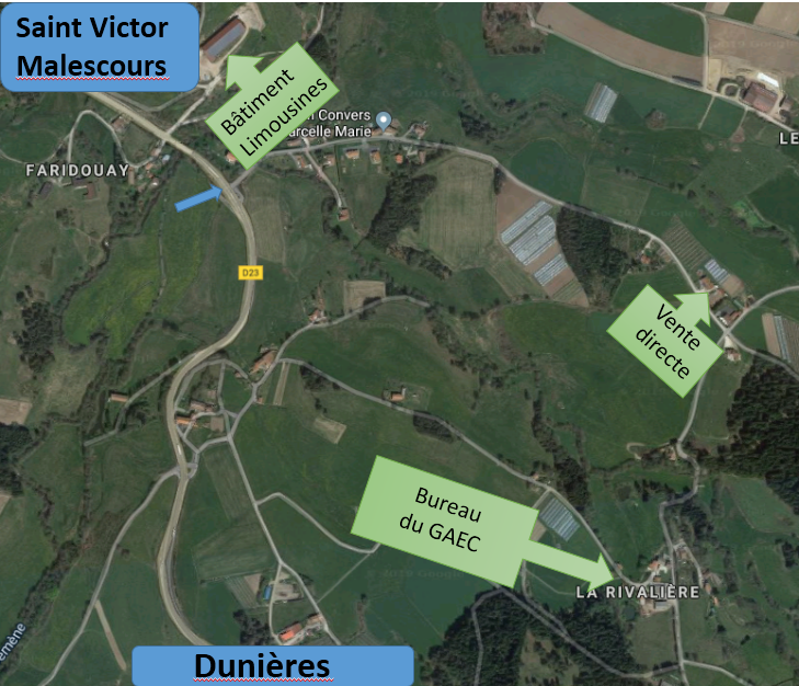 A la sortie de la foret, continuer sur la CD 23, délaisser Saint Victor sur votre droite. En bas de la descente passer sur le pont, tournez à gauche 50 m après.